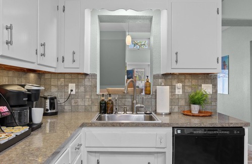 KITCHEN: Dishwasher, electric stove/oven, refrigerator, microwave, cooking basics, dishware & flatware, spices, breakfast bar w/ seating, coffee maker, toaster oven, blender, kettle, trash bags & paper towels
