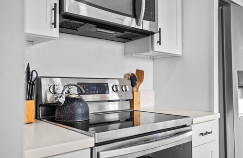 The fully stocked kitchen includes state-of-the-art stainless steel appliances, quartz countertops, and farm-style sink—perfect for cooking up meals to enjoy together. Parking is free and easy on this charming residential street, though availability is limited after 6:00 PM. Walk to Old Town and the trolley station or drive less than 10 minutes to the Airport.