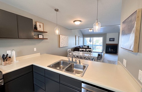 The dining room has a 6 person table ready for your family meals and evening card games. It's fully open to the living room. The kitchen features all the things you need to cook (pots, pans, blender, water boiler, coffee maker, measuring cups, bowls, plates etc), including a dishwasher. There is also a stackable washer/dryer and a half bath.