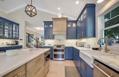 Upon entering our home, you will walk into a jaw dropping custom built culinary kitchen. Accessorized with Smeg tea kettle and toaster, along with a Keurig, espresso machine and toaster oven. Our kitchen also features a stove, dishwasher, refrigerator and wine cooler. Not to mention the beautifully curated glassware and serveware. The kitchen island offers barstool seating with a breakfast table off to the side. The kitchen alone is an Anthropologie dream in every way.