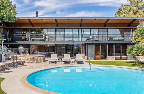 This Palm Springs paradise home, designed by architect Walter S. White, offers a serene mid-century modern retreat with stunning amenities. Featuring a main house and a guest house, redwood paneling, floor-to-ceiling glass walls, a circular swimming pool, and a desert garden, guests can unwind while enjoying panoramic views of the Coachella Valley.