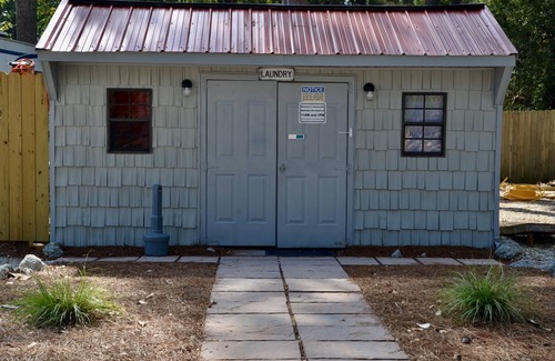 Plenty to enjoy in a picturesque setting. You must be able to climb ladders to access sleeping lofts. 1 queen & 2 twin beds. Cabin has in-room full bath with toilet, sink and full size hot water shower. Bathroom is divided by a privacy curtain. You will also have access to a bathhouse with full size refrigerator, washer, dryer and additional sink, toilet & shower. Kayaks, dock, gazebo, gas flat top grill, fire pit. Heat, AC, TV, WiFi & kitchenette. Six minutes to historic downtown New Bern.