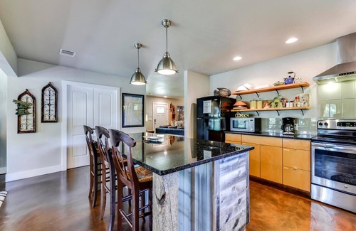 The open kitchen at Birdsong Cabin has black granite counters with a huge center island for entertaining. There are open upper shelves, fully stocked with kitchen dishes, barware and glasses. We provide most small and large appliances you have at home. Outside the back patio has a charcoal grill and outdoor wrought iron furniture. Don't forget your laundry detergent, charcoal, lighter fluid, coffee, shampoo and conditioner.