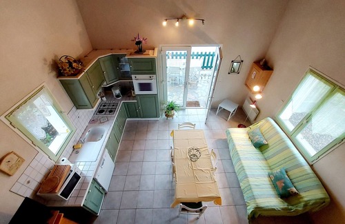 Weekly reservation: Saturday 4 [hidden] to Saturday 10 [hidden] Your accommodation includes: on the ground floor: a 22m² living room with equipped kitchen area, an 11m² bedroom with 1 140 cm bed, a shower room with toilet. Upstairs: a mezzanine bedroom with 2 single beds. Access via the pontoon: fishing room.