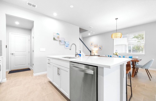 The home’s bright and modern interior is the perfect spot for relaxing in the cool air conditioning while catching up with friends and family. Sink into plush sofa seating in the living room while you stream all your favorite entertainment on the smart TV. A sliding glass door leads you out to the covered back patio where you can soak in serene views of the water while sipping on your morning coffee or a refreshing afternoon cocktail. Back indoors, an additional living space on the second floor offers even more comfortable seating and a TV along with board games and a gaming console that will rev up your competitive side.