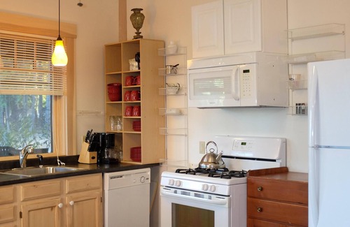 On the 1st floor the Pavillion has 1 bedroom with a queen bed and a twin bed, 1 bathroom, and a kitchen, living area with two twin beds (good for kids), dining area and a large screened in porch with an additional dining area.