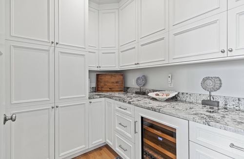 Ascend to the second floor, where a state-of-the-art kitchen awaits. With a large kitchen island and a butler's pantry featuring a wine fridge, this space is a culinary haven. A convenient half bath with a washer and dryer adds to the practicality of this floor.