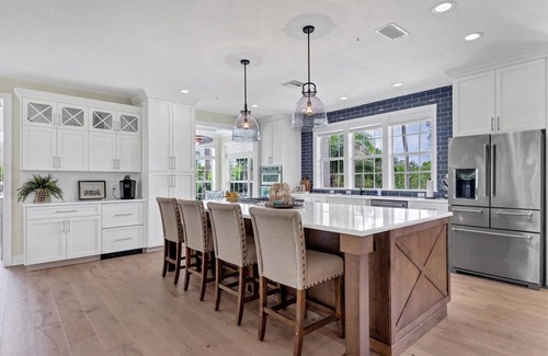 The open-concept floor plan and meticulous attention to detail set the tone for a refined coastal escape. Elegant living and dining areas flow seamlessly to the outdoors, where large windows frame views of the pool terrace and lush greenery. The fully equipped kitchen is appointed with high-end appliances, a spacious island, and ample storage—perfect for preparing meals to enjoy at the dining table overlooking the pool.