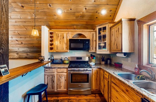 Step inside this cozy cabin, thoughtfully designed to ensure a relaxing and convenient stay. Spend quality time in the inviting living room, where your loyal companion can join you for a quiet evening, or take advantage of the deck to bask in the breathtaking views of the surrounding mountains and valleys. Ready to indulge in a tasty meal? Fire up the grill for a perfect barbecue, or prepare your favorite dish in the fully equipped kitchen featuring a fridge, stove, oven, dishwasher, and microwave – everything you need to feel right at home.