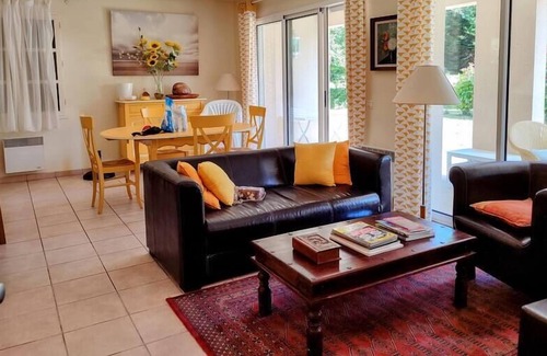 Well equipped vacation home in a privileged environment: The golf course of La Baule. With swimming pool. Suitable for a vacation or a Zen break as a couple, with family or friends. Two suites (spacious bedroom, individual bathroom, dressing room and private terrace each), a living room kitchen with fireplace opening onto a large terrace and a private garden not closed.