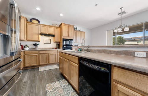 As you step inside this two-story home, you'll be greeted by central air-conditioning, an abundance of sunlight, and ceilings that soar up to the second floor. There are two spacious living rooms that connect to each other with a pass-through window - the first offering leather seating and a dining room table, and the second featuring plush seating, a streaming-capable TV, and an open view of the eat-in kitchen. There you'll find every essential appliance (including a double-drawer, French-door refrigerator) and a breakfast table for four. Just outside the back door is a shaded outdoor lounge space where you can sip cold drinks as the kids take a dip in the pool.