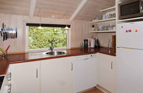 Layout: open kitchen(cooker(electric), hood, coffee machine, microwave, dishwasher, fridge-freezer, tumble dryer, washing machine), Living/bed room(TV(german television channels, danish TV channels (DR1 and TV2)), high chair), bedroom(double bed, children's bed), bedroom(double bed), bedroom(double bed), bathroom(floor heating)(bathtub or shower, washbasin, toilet), Bubble bath(indoor, heated, 2 persons), sauna(indoor, heated, 2 persons), heating(electric), terrace, terrace(roofed), play equipment