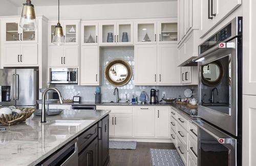 Step inside and be captivated by the splendor of Whispering Waters. With four bedrooms, including two magnificent master suites, along with 4.5 baths and two spacious living areas, this home comfortably accommodates up to 10 guests. Every detail has been carefully considered to ensure your utmost comfort and enjoyment. Prepare your favorite vacation meals in the chef's dream kitchen, equipped with a double oven, induction cooktop, two dishwashers, two sinks, and a wine refrigerator nestled in the kitchen island. The kitchen becomes a hub of culinary inspiration, allowing you to create delicious feasts while enjoying the company of your loved ones.