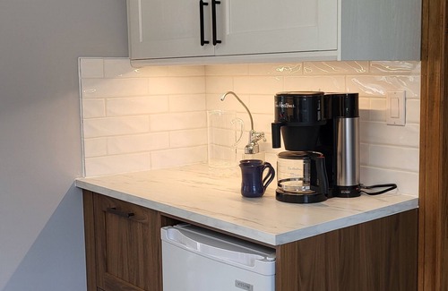 April 2024 - kitchen remodel and powder room addition are now complete! Check out the pictures of our new kitchen, with all new floors, cupboards and appliances. The large fridge has an ice maker (made with filtered water). The microwave above the new range is also a range fan. The new coffee / bar features a filtered water tap for easy filling of coffee pots and drink pitchers. The mini fridge is perfect for all your cold drinks needs.