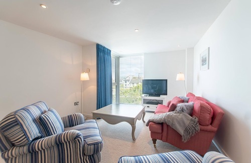 The open plan living and dining room, with stunning sea views across Carbis Bay, is furnished with a deep comfortable sofa, two armchairs and Smart TV, making this an ideal space for spending time with family and friends.