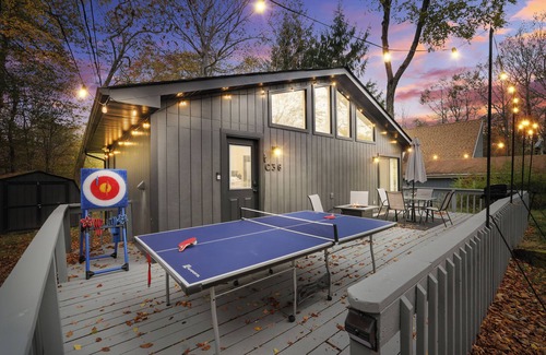 Escape to The Mountain Lake Cabin--your Cozy/Rustic Cabin nestled in the beautiful Pocono Mountains. Your stylish cabin has 3 bedrooms with 1 Queen 1 Full and 2 Twin beds.