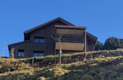 Our beautiful holiday flat is situated in a very quiet location directly on the hiking trail and forest above Weggis We rent a bright 4.5-room flat on two floors: bright living room with dining room, 2 bedrooms each with a double bed (1.60 cm), 1 bedroom with futon bed (1.60 cm) and air conditioning, well-equipped kitchen with Nespresso machine, without dishwasher, spacious bathroom with bathtub and toilet. New terrace with wonderful lake view. Seating area under the tree can be shared. WLAN available. Special feature: the bedrooms have no doors. They are separated by curtains. The flat is located at the end of a feeder road with no through traffic. Very quiet and a paradise for children. Weggis on Lake Lucerne with its large hiking area (Rigi), indoor swimming pool, boat trips, mountain railways and folklore offers relaxation and fun. Riding facilities at the neighbour. You can reach the centre of Lucerne in 40 minutes by boat from Weggis.
