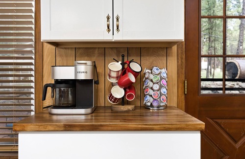 On an acre, the 1064 square foot Rogue Bear sits at 7000 feet of elevation in the Tall Pines, between Flagstaff and Williams, the Gateway to the Grand Canyon. Beautifully decorated and furnished, it has a King Bedroom, a Queen Bedroom, and a bunk room 4 and a pack-and-play on request. There is one full bathroom, and modern large capacity stacked laundry. It has a fully equipped kitchen, all linens, all the comforts of home, and then some. Children of all ages will love the horseshoes and cornhole in the back, and everybody will enjoy the firepit. Sit on the porch, and gaze out at the trees and wildlife.