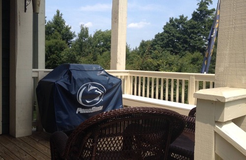 Spacious ground level deck just off the dining area with lots of seating and a propane grill.
