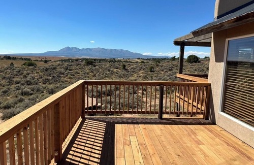 This isolated well-equipped house is centrally located in South East Utah. Many parks and monuments are within a 60-90 minutes drive: Moab, Arches, Canyonlands, Bears Ears, Monument Valley, Four Corners Monument, Hovenweep, Mesa Verde, Durango. The property consists of a modern 1800 sq ft house that is laid out with an open 2nd floor above a bedrooms 1st floor. Views of the surrounding high desert, farmland, and Abajo Mountains are seen from the decks. The village of Monticello is 8 miles away and has many services, restaurants, and a grocery store. The property has 2 WiFi networks from independent providers StarLink and River Canyon Wireless. Cell phone service exists as well. There are three 4K smart TVs and two large computer monitors. Desks are in each bedroom. Double beds are in 2 bedrooms. A single+single trundle bed is in the third. A pullout couch is in a semi-private alcove. A futon bed is in the 2nd floor common area. Extras: jacuzzi, detached garage with a bonus bathroom, extensive parking for toy haulers, RVs, and horse trailers. Enjoy the main house, detached garage, and 15 acres. The barn is not for guest use.