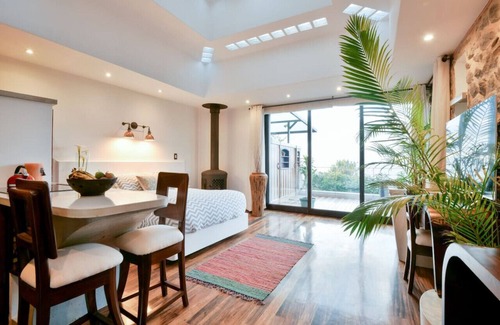 Villa "Pyramid House" is a self-contained gem designed for two. It features an open-concept bedroom with a queen-sized bed, luxurious linens, and a private ensuite bathroom. The bedroom opens onto a spacious deck with large sliding doors, offering breathtaking panoramic views of the three majestic 13,000-foot volcanoes: Agua, Fuego, and Acatenango.