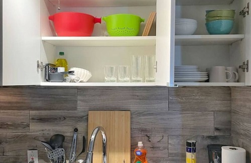- Kitchenette with utensils, pots, pans, plates, bowls, cups and more.