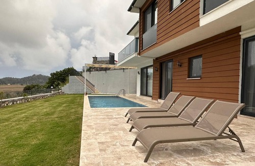 Sarigerme village Turkish Riviera region Dalaman Airport 20 mins Newly constructed luxury villa Fully furnished and equipped Air-conditioned throughout 3/4 bedrooms Sleeps 6 to 8 persons 2 ensuite bathrooms Jacuzzi Balconies Media room (4th bedroom, converting sofa double bed) Wifi tv (international channels) Downstairs WC Modern kitchen Utility room (clothes washing machine, ironing) Open plan lounge (converting sofa double bed) Wifi throughout Pool (private) 3 separate terraces (pool patio, covered, barbecue) Terrace garden Outdoor furniture Outskirts of Sarigerme village Nearby beaches Highly secluded views Stargazing dark skies, sunrise over the hill Mountain views Nature - birds, butterflies, wildflowers Hill and riverside walks SARIGERME 2km to centre 1.5km to supermarket The village as well as catering for tourists has amenities Restaurants/bars Bazaar street shopping Sarigerme Diving Sarigerme Paragliding Jeep Safari from Sarigerme Taxis and buses LOCAL ATTRACTIONS Beaches Turkish Aegean, Turquoise Coast Sarigerme Beach (Blue Flag award) 3.6km Asi Koyu (hidden beach) 11 km Iztuzu Beach (turtle sanctuary) 15km Sarsala Cove 28km Dalyan (19km) Lycian Rock tombs Kaunos ancient ruins and amphitheatre River and lake cruises Hot spring pools Mud bathing Gocek (27km) Islands boat tours Turtle watching Dalaman 12 km Sulphur springs, various starting from 6km Yuvarlak Cay 36km Cold Mountain Springs, river restaurant Mountain drives Town markets (buses) Migros Jet supermarket 2.4km Sevikoglu supermarket 1.6km.