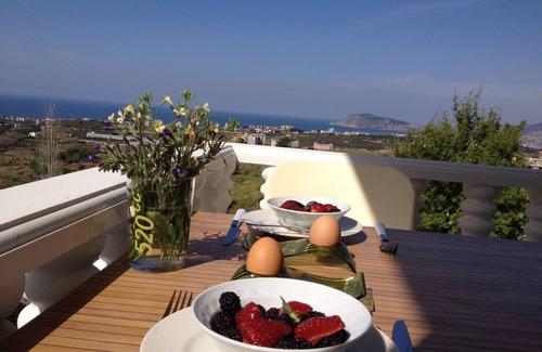 This astonishing Villa is so very special, because it is Not situated in a villa holiday parc, but just in a beautiful natural environment above Alanya, only 2000 meters from the beach and city center (Bus departures directly from the villa). Although nearby the facilities, it guarantees you privacy and a peaceful surrounding area. Among the Orange trees, Oleander & Bougainville, you can enjoy the smell of blossom, the panoramic Sea view, and the excellent food from your own BBQ. You would like some more? Choose between your three terraces! Walk out of your bedroom directly into your own Swimming pool. The Pool is totally private, no neighbors can see you. Two bedrooms are provided with their private bathrooms, Two other bedrooms have a very luxury bathroom to share. In your living you have a magnificent Sea-view, or at the other side, a beautiful Mountain view through your special panoramic window. At the same time, all windows are protected with curtains or blinds for optimum privacy!